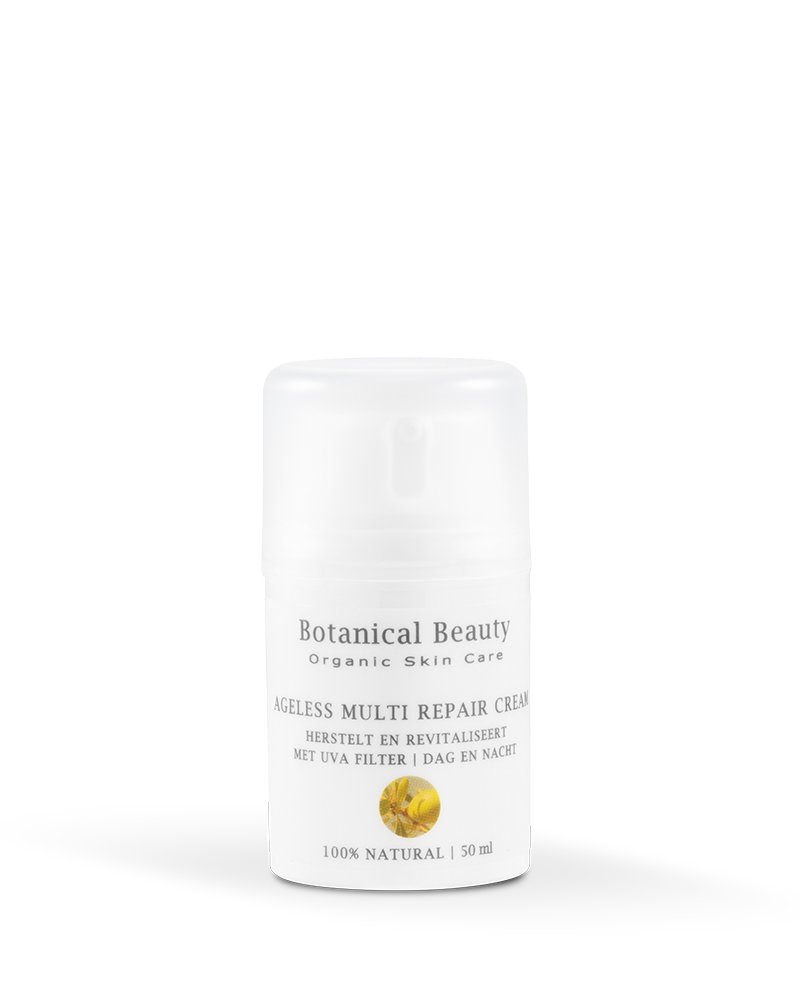 De Multi Repair Crème is een hydraterende anti-aging crème die dag en nacht verzorgt en zich richt op herstel van de beschadigde huid of schrale huid. Deze crème is speciaal ontwikkeld voor de probleemhuid en voor de huid met fijne lijntjes en is rijk aan biologische ingrediënten. De arganolie heeft een heilzame werking, verzacht en voedt. Ook kan de crème worden ingezet voor de jeugdige huid als je kiest voor UVA-bescherming of het herstellen van de huid.